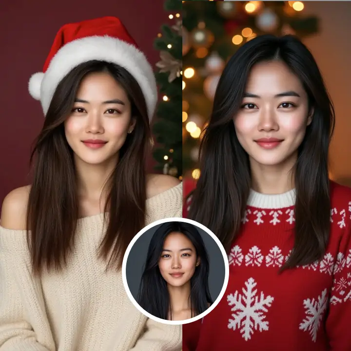 Try various styles of outfits and backgrounds to create your personalized Christmas look and showcase your unique charm